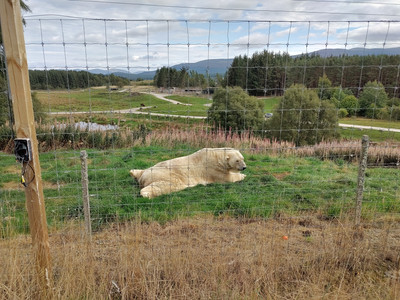 One of the highlights of our visit to Highland Wildlife Park was seeing the polar bears. The Park is home to two males- Walker and Arktos- who have a huge habitat where they can roam around. On the day of our visit, one of the males (not sure which one but we think it might have been Arktos) was enjoying some time at top of the hill and we were able to view him up close and personal. As a fun side note, we couldn't help but laugh when we saw that he likes to stretch out his back legs just like our wee Golden, Stirling 😂.
